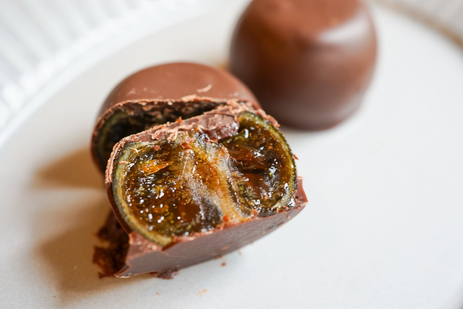 このシークワーサーには、オペラチョコレートさんのさわやかなバニラの甘さのように感じるチョコレートをコーティングしています。味わいのマリアージュを考えた組み合わせです。