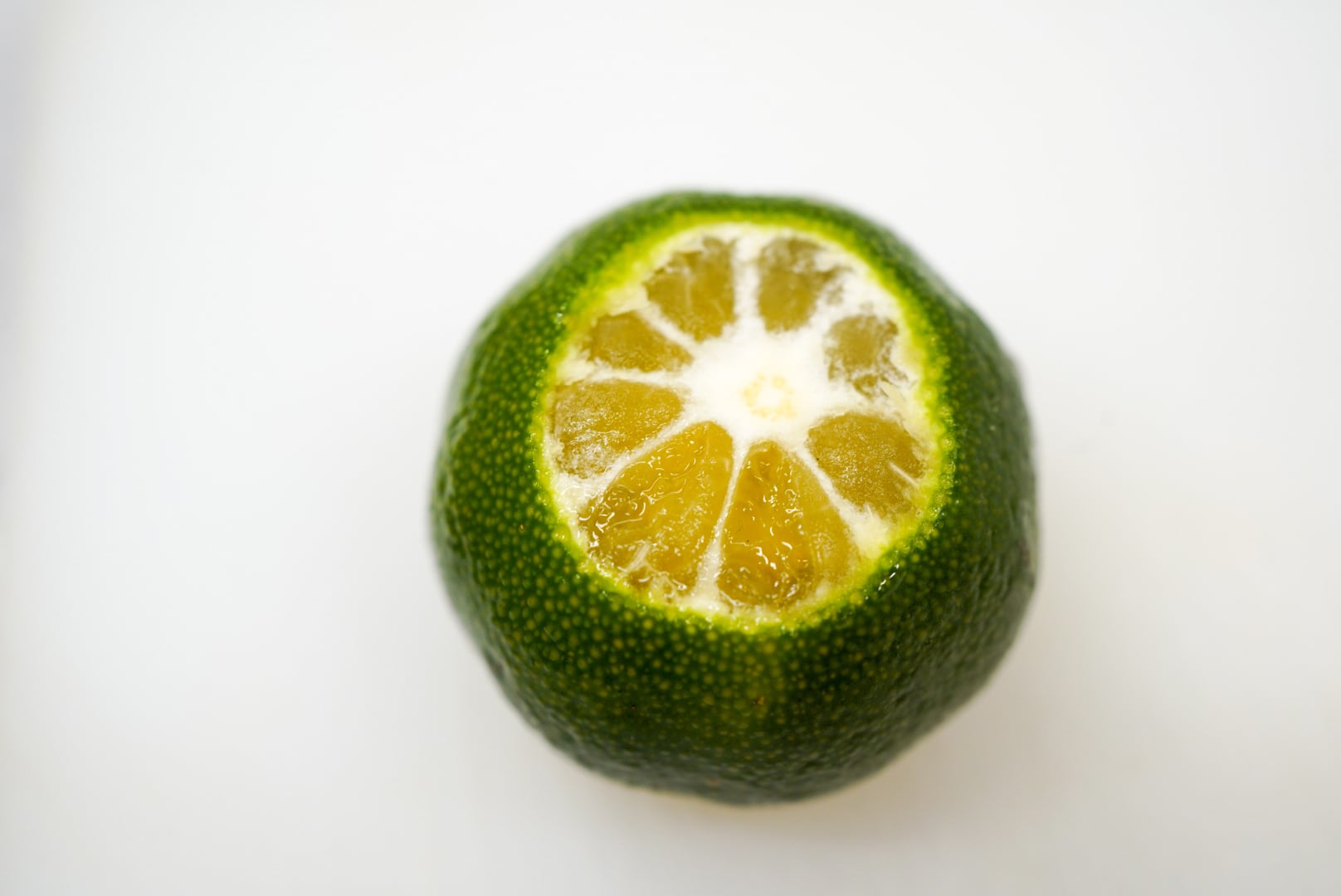 小さなシークワーサーを、上下を少しずつ切り、丸ごとのオランジェットにしました。